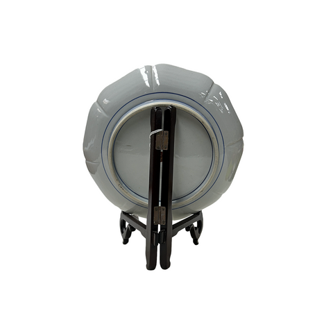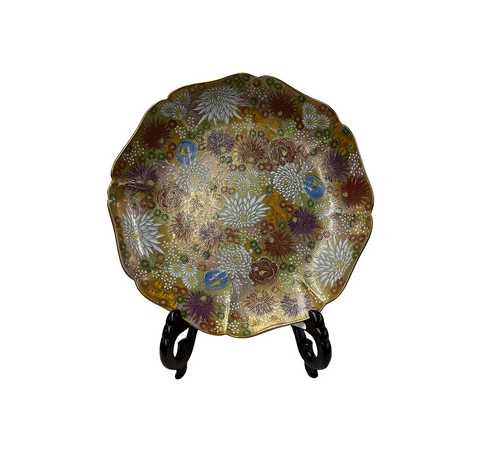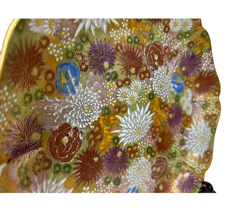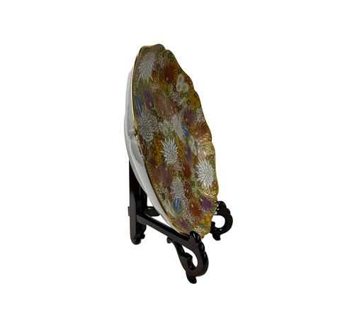 This exquisite porcelain plate is a breathtaking masterpiece of Japanese decorative art, radiating opulence from every inch of its surface. Its gently scalloped rim, edged in lustrous gold, frames an intricate tapestry of chrysanthemums (kiku) in full bloom, rendered in the finest moriage technique where raised slip creates a delicate, almost three-dimensional texture. Each petal shimmers with hand-painted enamel in rich jewel tones (deep crimson, violet, pale celadon, ivory, and soft gold), while generous applications of gilded accents catch the light like scattered sunlight on autumn foliage. Tiny raised beads of white enamel mimic dewdrops among the blossoms, adding a tactile, almost ethereal quality. Resting gracefully on a carved wooden stand, the plate evokes the refined elegance of Meiji-period Satsuma ware, blending meticulous craftsmanship with a quiet celebration of nature’s fleeting beauty, making it as much a work of art as a functional object.