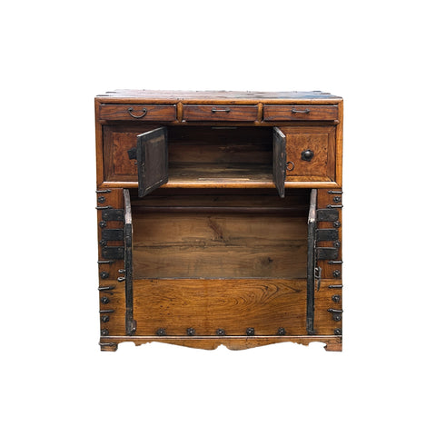 This antique chest, likely a Japanese Tansu or a Korean Bandaji, showcases a striking blend of rustic utility and intricate craftsmanship. Constructed from warm, honey-toned wood with a prominent, undulating grain—possibly elm or zelkova—the piece is heavily reinforced with hand-forged iron hardware. The lower section features a large drop-front or double-door compartment secured by wide, decorative iron hinges and a central butterfly-shaped lock plate, while the upper register is divided into three small drawers and a set of basted-veneer cupboard doors.