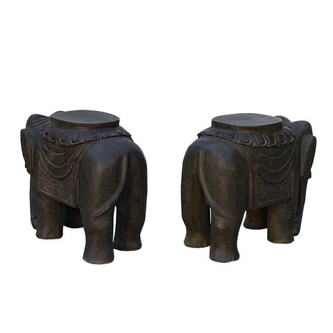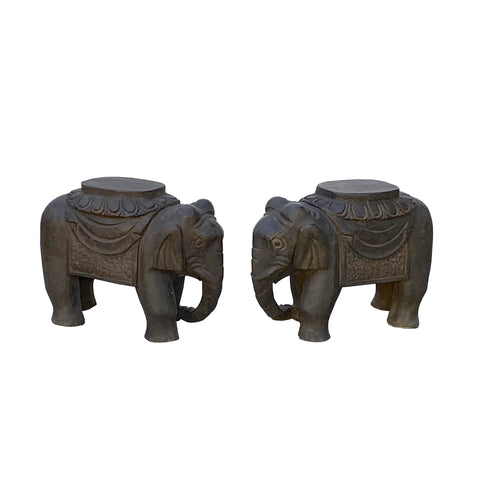 This pair of hand-carved elephant garden stools statues exudes a sense of grounded, ancient elegance. Crafted from a dark, weathered stone with a deep charcoal patina, each figure is sculpted into a stout, stylized elephant standing in a steady, four-square pose. The elephants are adorned with ornate, traditional saddles featuring scalloped lotus-petal borders and draped caparison cloths textured with subtle, incised patterns. Their trunks are gracefully curled inward toward their chests, while their ears are flattened against their heads, creating a compact and sturdy silhouette. The flat, circular platforms on their backs provide a functional surface, making them as practical for seating or display as they are aesthetically striking. Together, they serve as a symmetrical set of guardians, blending rustic artistry with a timeless, regal presence.
