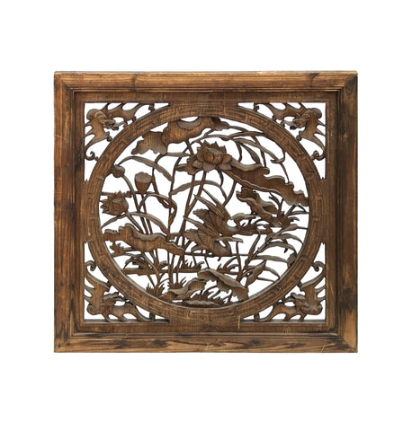 This striking piece is a beautifully hand-carved antique Chinese wood panel, featuring a traditional circular medallion design known as "Lotus Pond with Cranes" (荷塘鶴影). The openwork carving, executed in rich, warm-toned wood, showcases a dynamic and highly detailed natural scene. At the center, two gracefully depicted cranes (symbols of longevity, peace, and good fortune in Chinese culture) wade amidst an abundance of lush lotus flowers and leaves (symbols of purity, enlightenment, and fertility). The central circular motif is framed by a square outer border featuring intricate stylized elements, possibly representing clouds or auspicious mythical creatures in the corners. The piece possesses a wonderful patina that speaks to its age and history, making it an exceptional example of traditional Chinese architectural or decorative art. Perfect for adding a touch of classic, sophisticated East Asian elegance and profound symbolism to any interior space as a unique wall hanging or screen element.)