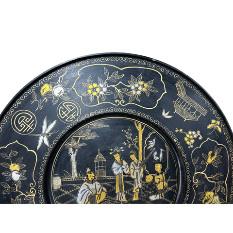 This striking decorative plate features a sophisticated Chinoiserie design, characterized by intricate gold and silver-toned linework set against a deep, matte black background. The central medallion depicts a serene courtyard scene where figures in traditional dress engage in leisurely activities: a seated man appears to be playing a game of Go or tending to a chest, while standing attendants and children look on amidst a landscape of stylized pines and cranes.