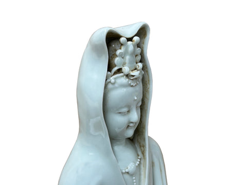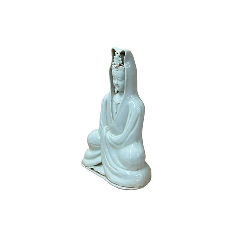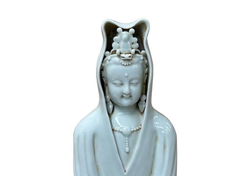 Embrace tranquility with this captivating Dehua Blanc de Chine porcelain statue depicting Guanyin, the Buddhist Bodhisattva of Compassion. Crafted with a luminous, creamy white glaze, the figure is shown seated in a serene, meditative pose, draped in flowing robes that fall in graceful, naturalistic folds. Notice the delicate details, from the serene expression and downcast eyes to the intricate beaded necklace and the ornate diadem partially concealed beneath the cowl. This statue embodies the refined artistry of traditional Chinese porcelain, bringing an aura of peace, grace, and cultural heritage to any collection or space. A timeless piece of devotion and decorative beauty.