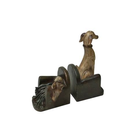 This pair of Art Deco-style bookends captures the elegant silhouette of greyhounds with a touch of whimsical storytelling. Crafted with a weathered, bronze-like patina, the set features two distinct poses: one hound sits alert and upright in a miniature armchair, its elongated neck and slender head exuding a dignified, watchful air. In charming contrast, the second hound is depicted completely "tucked in," draped lazily over its chair with its head hanging off the side and a flowing, textured blanket spilling down toward the base. The dark, verdigris finish of the chairs complements the lighter, cream-and-sepia tones of the dogs, creating a sophisticated vintage aesthetic that balances formal sculpture with a cozy, domestic narrative.