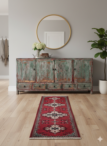Long Rectangular Red Geometric Medallion Graphic Wool Rug Carpet Runner GB295S