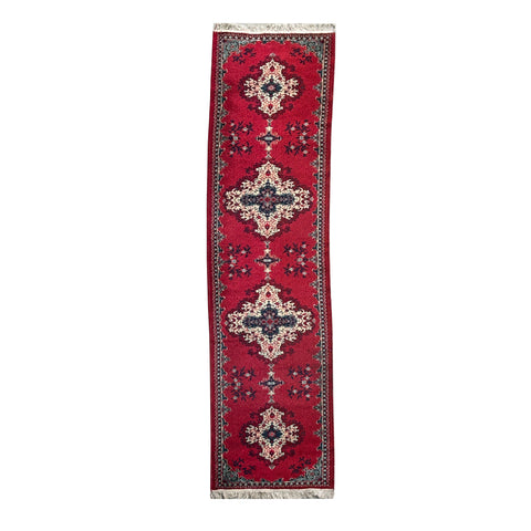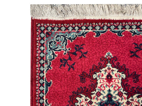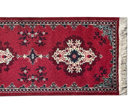 The rug is framed by a geometric border that repeats a diamond-like pattern in teal and white, providing a crisp edge to the decorative interior. At both ends, the piece is finished with short, off-white fringe, while the visible texture suggests a plush, soft pile that catches the light differently across its surface. Its elongated proportions and traditional aesthetic make it a striking accent piece, blending bold color with timeless craftsmanship.