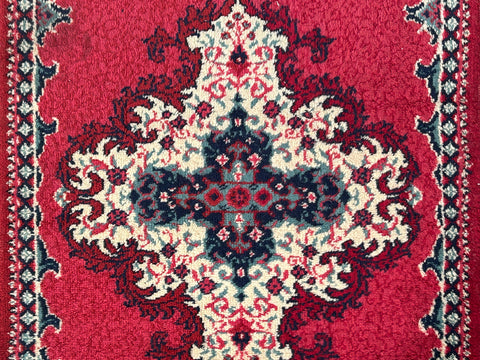 This vibrant red runner rug features a classic, ornate design characterized by a series of three large, symmetrical medallions aligned along its center. Each medallion showcases a complex, multi-layered pattern in shades of cream, navy blue, and subtle touches of teal, creating a sharp contrast against the deep crimson field. Smaller, stylized floral motifs and geometric accents are scattered throughout the open space between the central figures, adding a sense of rhythmic detail to the overall composition.