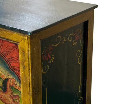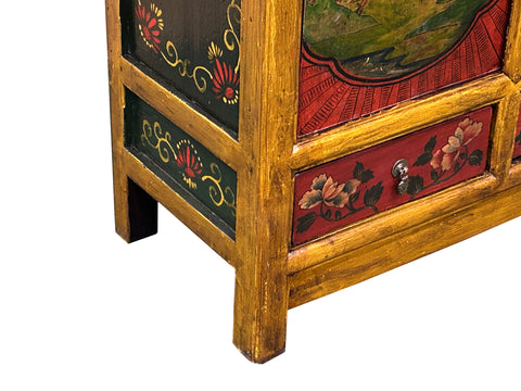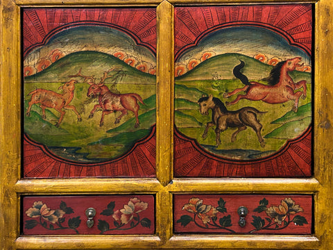 Discover the timeless elegance of this exquisitely crafted Tibetan-style cabinet, adorned with stunning hand-painted deer and horses graphics. This beautifully designed piece features vibrant red and green landscapes, framed by intricate gold detailing, showcasing traditional artistry that brings a touch of cultural heritage to any space. With two spacious drawers decorated with delicate floral motifs and a sturdy interior storage area behind double doors, this cabinet offers both functionality and aesthetic appeal. Perfect for adding a unique, rustic charm to your home, this Tibetan-inspired furniture is a must-have for collectors and interior design enthusiasts alike.