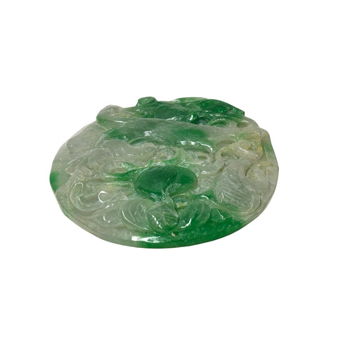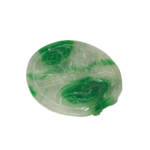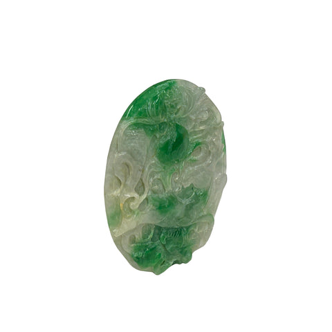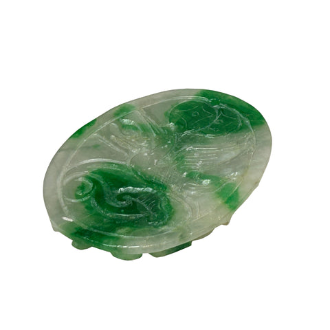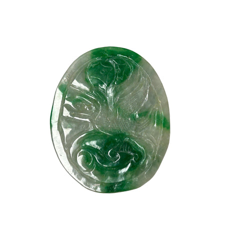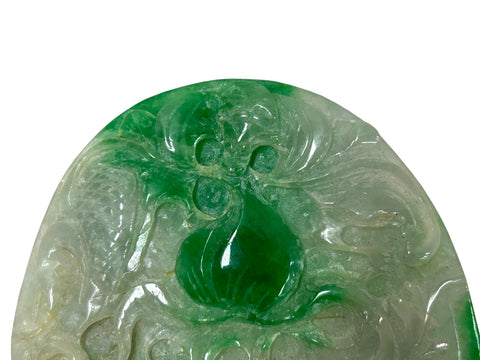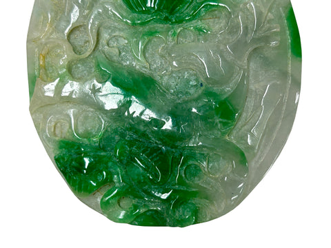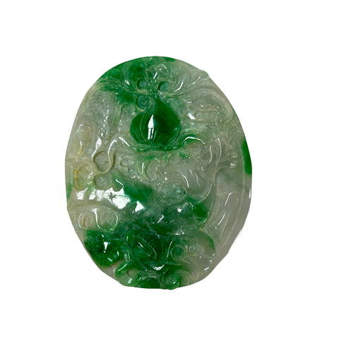 This intricately carved jadeite plaque showcases a vibrant interplay of translucent white and rich emerald green hues, characteristic of high-quality "moss-on-snow" jade. The oval-shaped piece features deep, fluid relief carvings that depict traditional Chinese motifs; on one side, a lush, saturated green peach or gourd sits at the center, surrounded by swirling, cloud-like filigree and what appears to be a stylized dragon or mythical bird. The reverse side continues this ornate craftsmanship, displaying a winged phoenix or crane in flight, its feathers finely etched into the stone's surface alongside ancient coin symbols representing prosperity. The stone's natural luster gives it a waxy, polished finish, while the varying thickness of the carving allows light to pass through the thinner sections, highlighting the crystalline structure and the organic distribution of the vivid green mineral veins