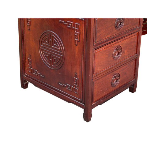 Elevate your home or office with this magnificent Oriental hardwood pedestal desk, a true testament to timeless design and superior artistry. Crafted from rich, lustrous hardwood, its deep, warm tones radiate an aura of sophistication and heritage. As seen from various angles, every detail is meticulously considered, from the elegantly curved top and the subtly recessed panels to the beautifully carved circular motifs adorning each drawer front, creating an aesthetic that is both commanding and graceful. This desk isn't just a piece of furniture; it's a statement, reflecting a discerning taste for enduring quality and classic elegance.