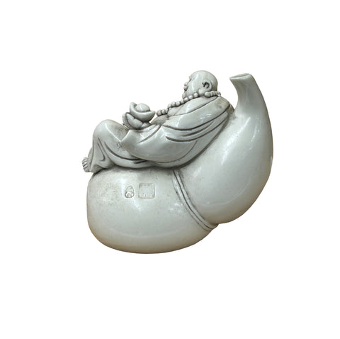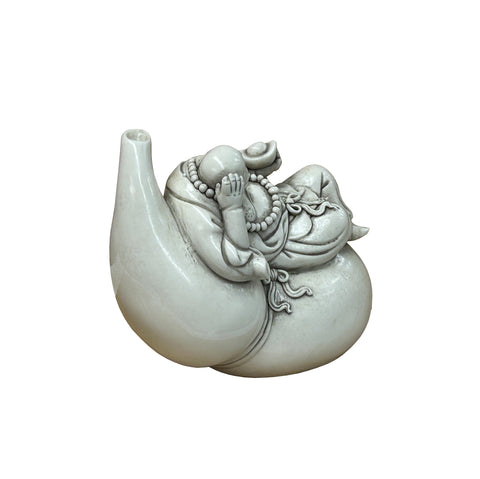 Capture the spirit of joy, prosperity, and good fortune with this beautifully carved vessel, depicting the beloved Laughing Buddha (Budai) reclining serenely upon a gourd (hulu). The intricate craftsmanship in the pale, luminous material highlights the Buddha's iconic smiling face, plump belly, and his prayer beads, radiating an undeniable sense of peace. He is shown holding a symbol of wealth, representing abundance and success. The gourd shape, historically a symbol of longevity and health in Asian culture, doubles as an elegant vessel with a graceful spout. This piece is much more than a decoration—it's a potent cultural symbol and a truly captivating centerpiece, perfect for bringing positive energy and artistic elegance to any home, office, or collection.