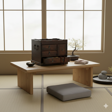 This antique-style Oriental wood chest features a rich, deep chocolate brown finish and a compact, functional design. Crafted from natural wood with visible grain patterns, the piece includes three stacked drawers on the left and a single small cabinet door on the right, all adorned with traditional, bat-shaped metal pulls that add a touch of cultural symbolism. The top of the chest is designed as a recessed gallery tray, showcasing a stunning burl wood inlay with intricate, swirling patterns that contrast beautifully against the dark frame.