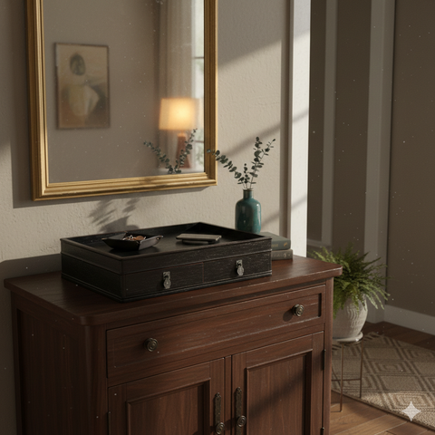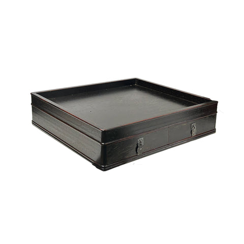 Built into the base are two shallow drawers equipped with ornate, silver-toned metal pulls. These hardware accents—shaped like traditional pendants—provide a striking contrast against the dark timber. The tray’s low profile and clean lines evoke a Zen-inspired or East Asian aesthetic, blending the utility of a chest with the accessibility of an open display. Whether the drawers are tucked away or pulled slightly open to reveal their craftsmanship, the piece serves as a sophisticated anchor for any interior space