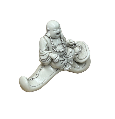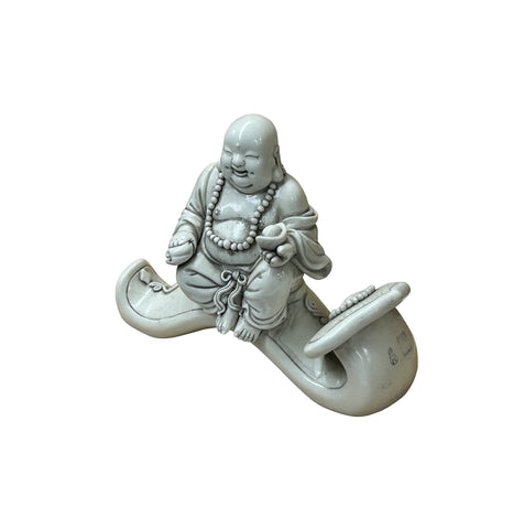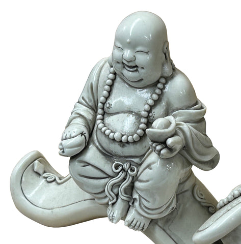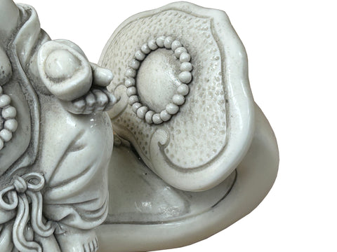 Bring a sense of joy, prosperity, and tranquility into your home or office with this exquisite ivory-hued Happy Buddha (Hotei) statue. Perched atop a gracefully curved Ruyi scepter—a symbol of power and good fortune—the Buddha's radiant, infectious smile and benevolent demeanor are captured in stunning detail. He holds a piece of treasure and is adorned with prayer beads, embodying abundance and spiritual peace. This unique piece, showcasing the Buddha resting comfortably on the traditional wish-granting implement, makes a powerful statement décor item and a thoughtful gift for anyone seeking to invite happiness and positive energy into their environment.