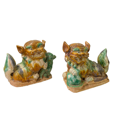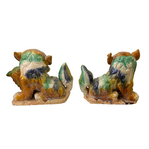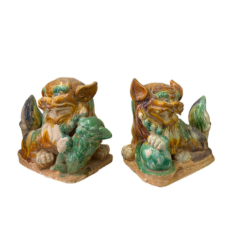 Pair Chinese Tri Color Glaze Ceramic Fengshui Fu Dog Figures vs525S