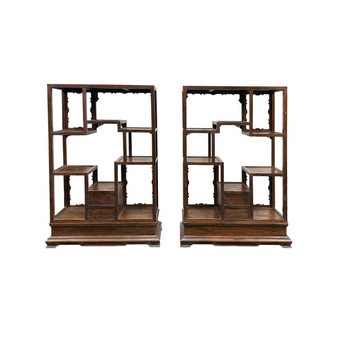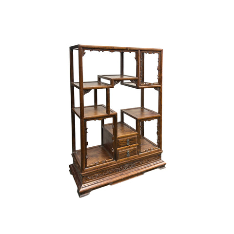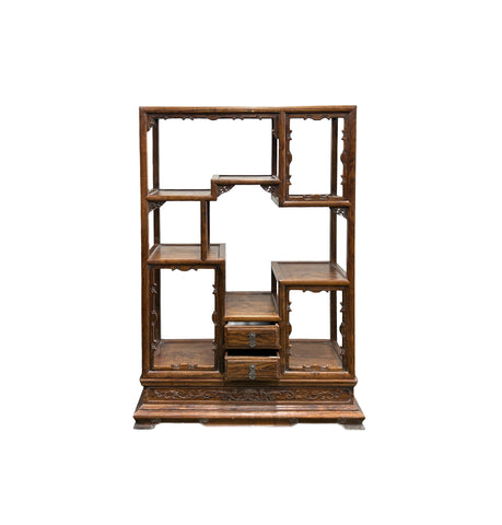 This exquisite Oriental "Treasure" Display Cabinet is a masterclass in traditional craftsmanship and asymmetric elegance. Hand-carved from richly grained wood with a deep, lustrous finish, it features a series of staggered, multi-level shelving compartments—specifically designed to showcase a curated collection of fine porcelain, tea sets, or antiques. Each opening is framed by intricate, scalloped scrollwork that adds a touch of architectural grace without detracting from your displayed items.