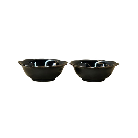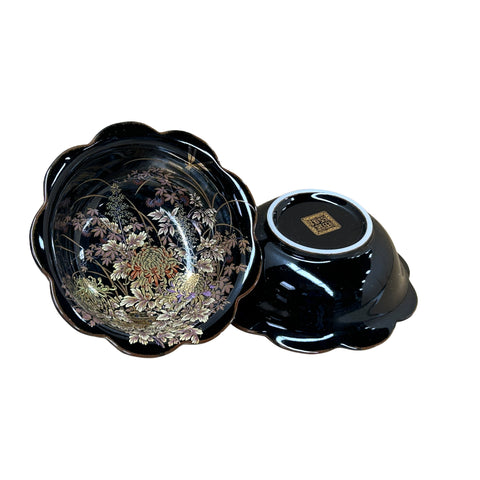 Pair Oriental Black Glaze Porcelain Bowls Golden Flower Graphic GB186S