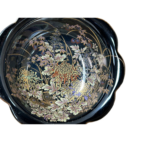 These exquisite porcelain bowls showcase the refined elegance of traditional Japanese lacquerware-inspired design. Each bowl features a lobed, scalloped rim that mimics the petals of a blooming flower, adding a soft, organic silhouette to the deep black, high-gloss interior. Within the basins, a lush and intricate scene of autumnal flora unfolds, dominated by large, blooming chrysanthemums rendered in muted tones of gold, cream, and dusty rose.