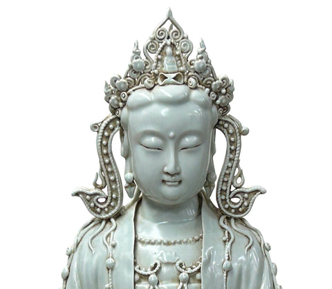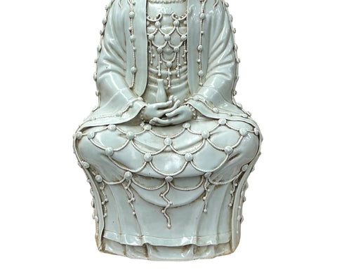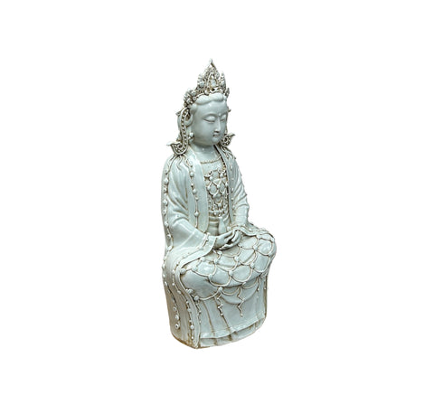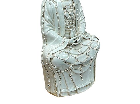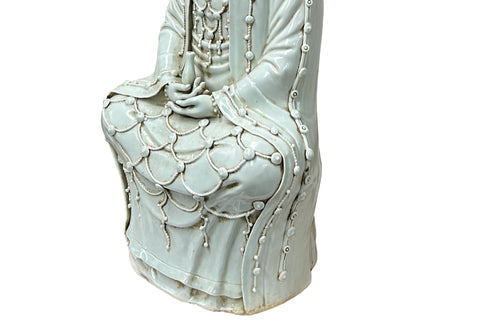 Capture the essence of tranquility and timeless elegance with this magnificent ceramic sculpture of a Bodhisattva, likely Guanyin, the Goddess of Mercy. Rendered in a stunning celadon glaze, the statue radiates a cool, ethereal glow, highlighting the intricate details of the craftsmanship. The figure sits in a posture of deep meditation, hands gently clasped in a mudra, wearing flowing robes draped with elaborate chains and beadwork applied in relief. Notice the richly detailed crown and the serene, downcast expression, conveying peace and profound compassion. This piece, with its superb modeling and beautiful pale green-blue hue, is a statement artifact perfect for collectors of fine Asian art or anyone seeking to introduce an element of grace, mindfulness, and historical beauty into their space.