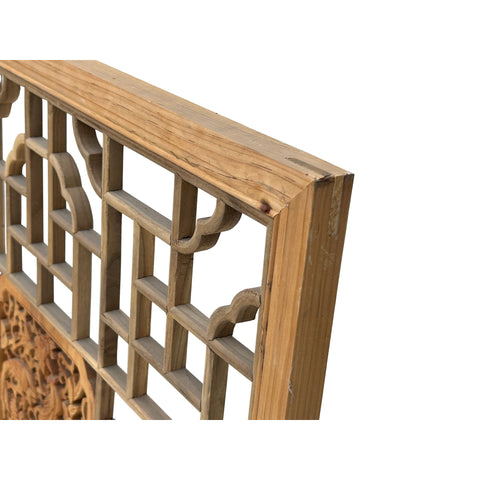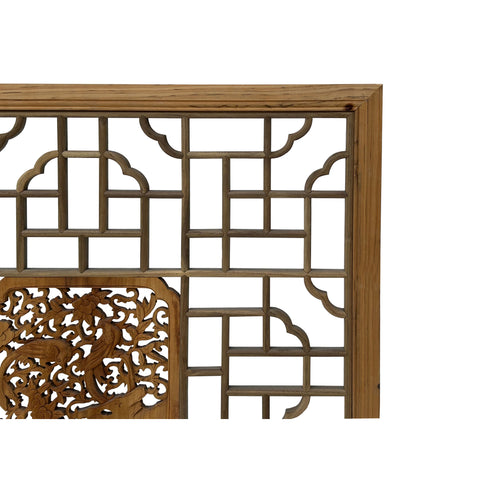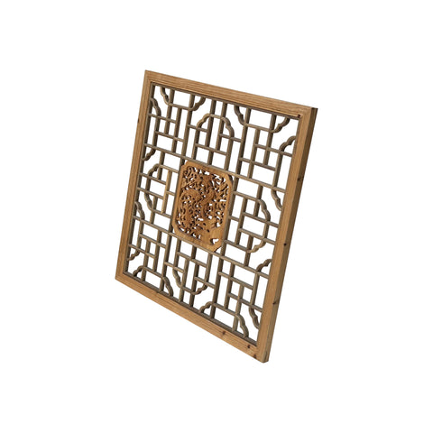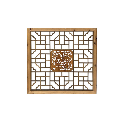 This square, hand-carved wooden screen is a beautiful example of traditional Chinese fretwork, often used as a window lattice or decorative wall panel. The outer frame is crafted from light-toned, natural wood that showcases visible grain and small knots, lending it an organic, rustic feel. The interior features a complex, symmetrical geometric pattern of interlocking rectangular and T-shaped joinery, accented by elegant, cloud-like scalloped corners. At the very center sits a deeply carved, rectangular medallion depicting a lush scene of birds perched among blooming flowers and twisting vines. This central focal point is rendered in a slightly richer, warmer wood tone, creating a striking contrast with the more minimalist, open-work lattice surrounding it.