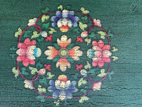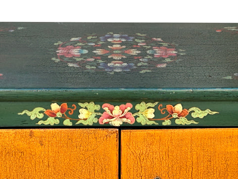 This eye-catching wooden cabinet features a vibrant, hand-painted aesthetic rooted in Tibetan or Himalayan folk art traditions. The piece is defined by its bold use of color, featuring a forest-green frame adorned with delicate floral scrollwork that encircles two central doors finished in a warm, crackled ochre. The focal point of the cabinet is a striking illustration of two tigers—one orange and one grey—intertwined in a dynamic, stylized pose. Their expressive faces and swirling stripes are rendered with a traditional charm that balances ferocity with decorative elegance.