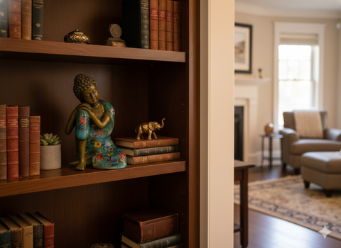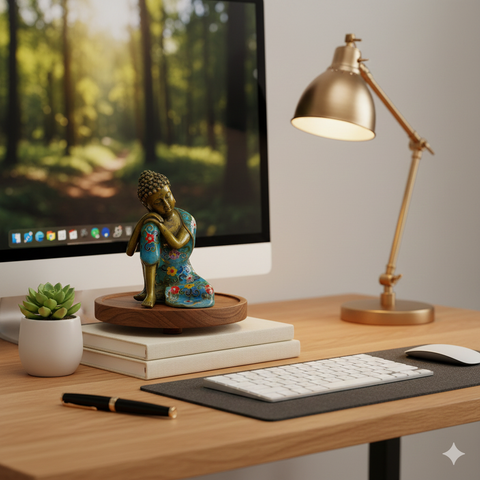 Invite a sense of profound peace and artistic elegance into your space with this exquisite Resting Buddha statuette. Crafted from heavy, antiqued bronze, the figure is captured in a rare moment of quiet introspection, leaning gently against his knee in a pose of "peaceful rest." This meditative silhouette is beautifully elevated by the ancient art of cloisonné, featuring a vibrant turquoise robe adorned with meticulously handcrafted floral patterns in rich crimson, sun-bright yellow, and deep cobalt.