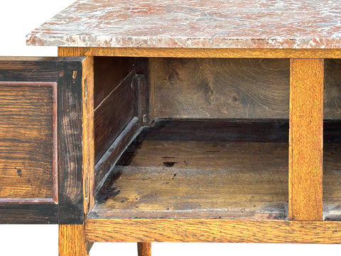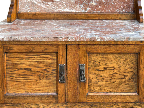 Presenting a charming antique washstand, a perfect blend of historic character and functional elegance. Crafted from richly-grained wood, this piece showcases a beautiful, warm patina achieved over time. The cabinet is crowned with a striking rose-colored marble top and a matching marble backsplash, featuring intricate white and gray veining that adds a touch of classic sophistication. Its two paneled doors open to reveal practical storage space, supported by gracefully turned legs. Complete with original period hardware, this versatile cabinet is ideal as a bathroom vanity conversion, a stylish bar cabinet, or a distinctive accent piece in any traditional or eclectic interior.