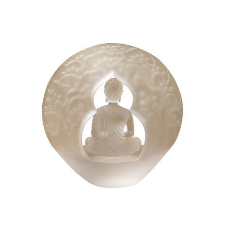 Immerse yourself in tranquility with this exquisitely crafted Buddha statue, a timeless piece that captures the essence of peace and contemplation. Sculpted from a luminous, frosted material—crystal glass —it features the Buddha seated in the Dhyana Mudra (meditation pose), symbolizing profound wisdom and inner focus. The figure is nestled within a softly backlit, circular archway that is delicately etched with stylized foliage and flowing water designs, suggesting the natural environment where enlightenment was achieved. This radiant, ethereal sculpture acts as a beacon of calm, casting a soft, gentle glow that transforms any space into a sanctuary of mindfulness. Perfect as a focal point for meditation areas, yoga studios, or contemplative home decor, this piece is an elegant and meaningful addition to your collection.