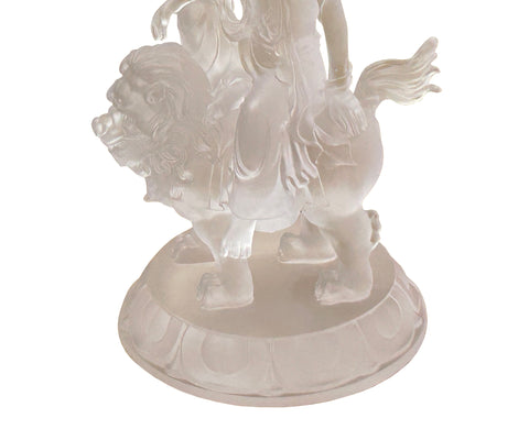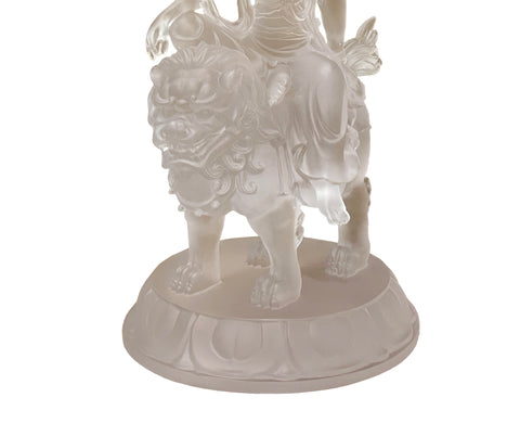 Elevate your space with this breathtaking, exquisitely carved crystal glass statue depicting a serene Bodhisattva, likely Manjushri (Wenshu Pusa), gracefully riding a magnificent lion. Crafted from luminous, clear material with a soft frosted finish, the piece captures light beautifully, showcasing the intricate detail of the flowing robes, the peaceful expression of the deity, and the powerful, mythic features of the guardian lion. The entire sculpture rests upon a stylized lotus base, symbolizing purity and enlightenment. This is more than a statue; it's a stunning, translucent work of art that embodies wisdom and strength, perfect for collectors seeking a piece of profound spiritual and aesthetic beauty.