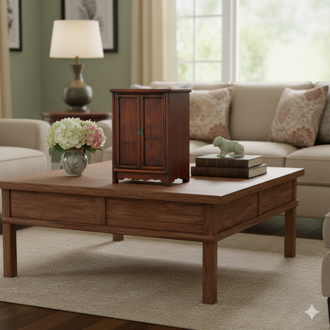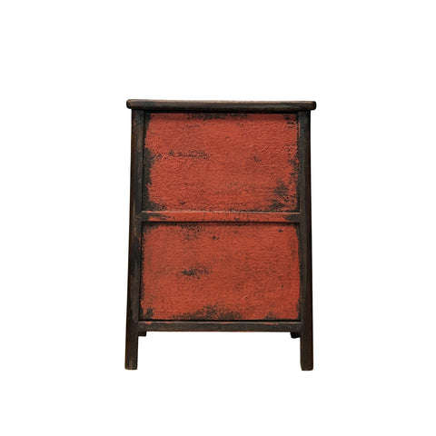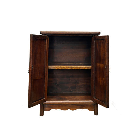 This small, Ming-style chest exudes a quiet elegance through its minimalist design and rich, warm wood tones. Crafted with a focus on clean lines, the cabinet features a pair of symmetrical, recessed-panel doors secured by traditional bronze-finish hardware, providing a subtle metallic contrast to the dark mahogany stain. The frame is constructed with rounded corner posts that flow seamlessly into short, sturdy legs, while the base is accented by a scalloped apron, adding a touch of ornate character to its otherwise disciplined silhouette. Its compact verticality and deep, lustrous grain make it a versatile accent piece, perfectly suited for use as a bedside table or an entryway catch-all.