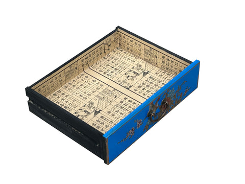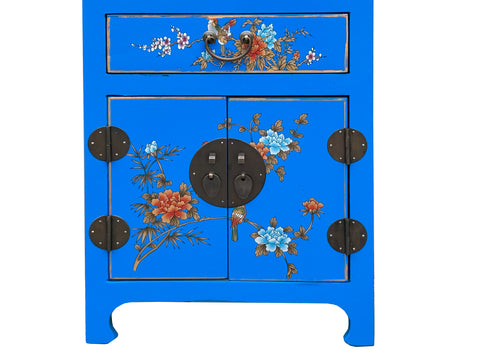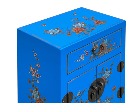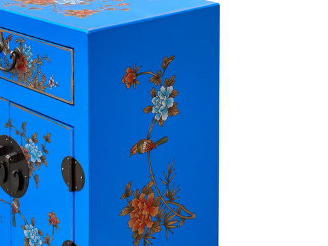 Step into a world of vibrant tradition with this stunning Chinese-style accent cabinet. Finished in a rich paint bright blue, the piece features an intricate veneer print graphic of peonies, cherry blossoms, and birds, symbolizing prosperity and good fortune. This unique piece offers charming and practical storage with a single drawer and a lower double-door cabinet, all adorned with classic bronze-brown color metal hardware. The interior is lined with decorative calligraphy-printed paper, adding an authentic touch. Whether used as a unique nightstand, an end table, or a focal point in your living space, this cabinet is an exquisite statement piece that brings a touch of timeless Asian elegance to your home.
