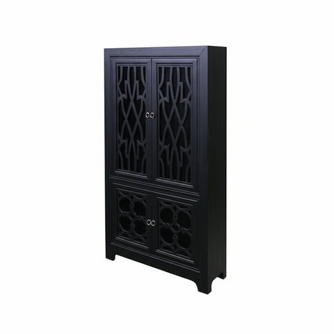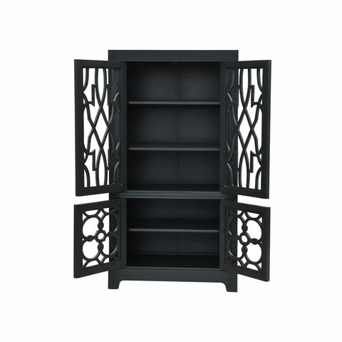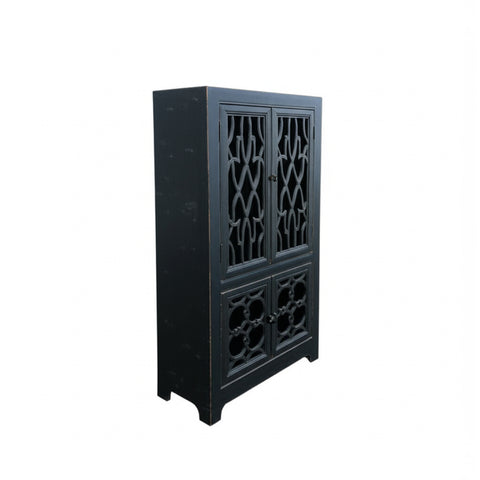 Introducing this hutch cabinet etagere, a stunning blend of classic design and modern functionality. Crafted from solid wood and finished in a rich, distressed black, this cabinet exudes a timeless elegance that will elevate any room. The unique geometric fretwork on the four doors adds a touch of intricate detail, creating a captivating visual that is both stylish and sophisticated.
