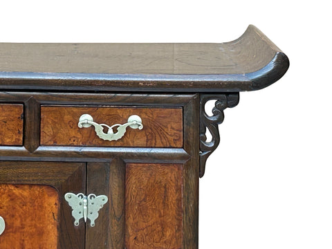 This is a beautiful example of a vintage Korean Bandaji chest (or similar traditional cabinet), characterized by its rich, dark wood and highly figured grain, likely from burled wood sections used for the central panels. The chest features an elegantly curved, slightly overhanging top reminiscent of traditional Korean rooflines. Functionally, it is divided into an upper section with three small drawers, each fitted with curved, brass pull handles. The middle section is dominated by a central pair of doors that open outward, revealing a sizable storage cavity . These doors are secured by a prominent, stylized brass butterfly hinge plate, flanked by four smaller butterfly-shaped escutcheons on the surrounding panels. The lower half features a pattern of rectangular, framed wooden panels, continuing the striking contrast between the dark frame and the lighter, patterned central sections. The entire piece is elevated slightly on bracketed legs with subtle, scrolled detailing, adding a final touch of refinement to this classic piece of Korean furniture.