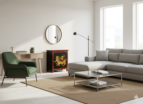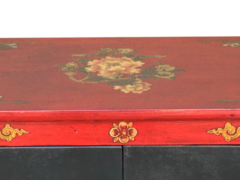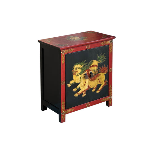 Add a bold statement of Eastern artistry to your home with this vibrant, hand-painted Tibetan nightstand or accent cabinet. Featuring striking depictions of mythical snow lions against a dramatic black backdrop, framed by a rich red and intricate gold detailing, this piece exudes cultural significance and visual intrigue. Perfect as a unique bedside table or a distinctive side cabinet, it offers practical storage behind its double doors while serving as a captivating focal point in any room. Embrace the spirit of the Himalayas with this handcrafted furniture, ideal for those seeking bold, symbolic, and high-quality ethnic décor that tells a story.