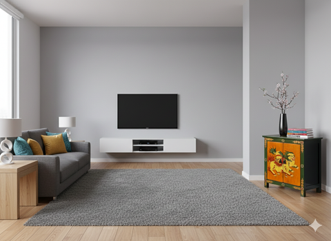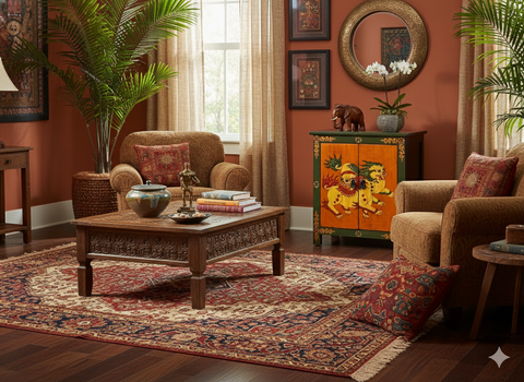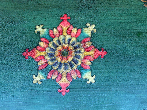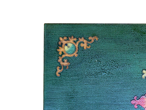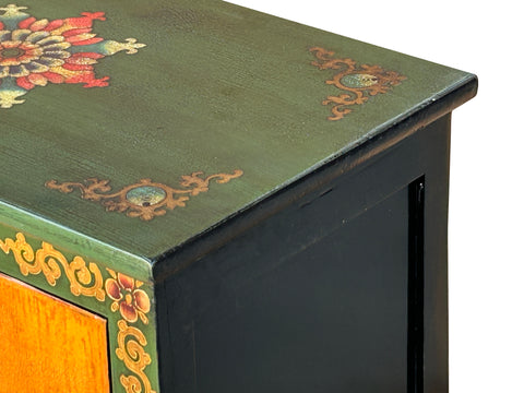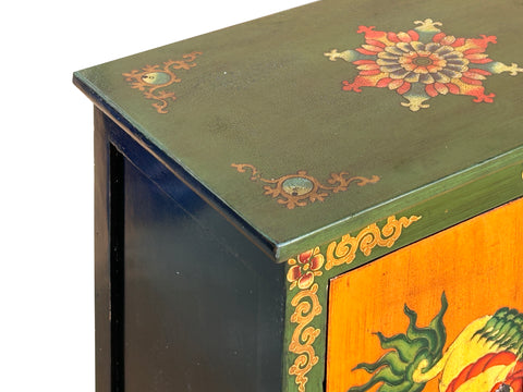 This handcrafted wooden cabinet features the vibrant and soulful aesthetics of Himalayan or Tibetan folk art. The piece is defined by a bold, dual-tone palette; the main frame is painted in a deep forest green, while the two central doors provide a striking contrast in warm, golden ochre. Intricate floral motifs and scrolling gold filigree adorn the outer frame, framing the central artwork like a sacred mural.