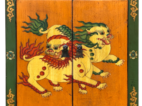 The focal point of the cabinet is a hand-painted depiction of Snow Lions, mythical creatures that symbolize fearlessness and cheerfulness in Eastern culture. Rendered with playful energy, the lions feature swirling manes of emerald green and fiery crimson, their bodies a creamy white with stylized red spots. The cabinet is finished with traditional dark metal pulls and rests on sturdy, straight legs, blending functional storage with a rich sense of cultural storytelling.