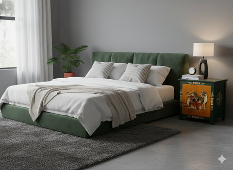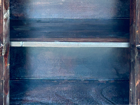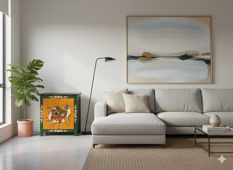 Designed for both form and function, the cabinet’s compact, rectangular silhouette is supported by simple, sturdy square legs. The top surface is also intricately decorated with a colorful floral mandala, ensuring the piece looks finished from every angle. When opened, the dual doors reveal a dark, minimalist interior with a single shelf, providing a clean contrast to the high-energy artwork on the exterior. This combination of crackled textures, rich pigments, and mythical iconography makes the cabinet a soulful statement piece.