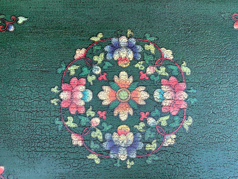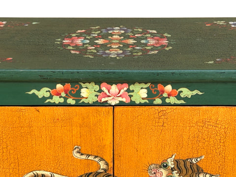 This eye-catching wooden cabinet features a vibrant, hand-painted aesthetic rooted in Tibetan or Himalayan folk art traditions. The piece is defined by its bold use of color, featuring a forest-green frame adorned with delicate floral scrollwork that encircles two central doors finished in a warm, crackled ochre. The focal point of the cabinet is a striking illustration of two tigers—one orange and one grey—intertwined in a dynamic, stylized pose. Their expressive faces and swirling stripes are rendered with a traditional charm that balances ferocity with decorative elegance.