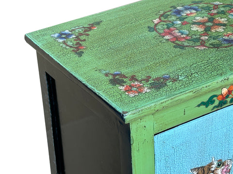 This striking, hand-painted wooden cabinet features a vibrant folk-art aesthetic, characterized by a bold palette of lime green, sky blue, and earthy tones. The front doors serve as a canvas for a dynamic depiction of two tigers—one tawny and one golden—intertwined in a spirited, stylized pose against a textured blue background. The artistry is defined by heavy "craquelure," a fine network of surface cracks that lends the piece an authentic, aged character.