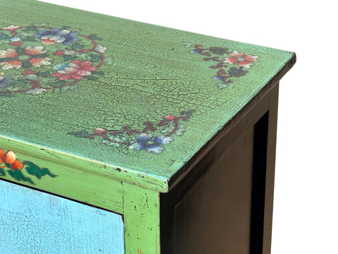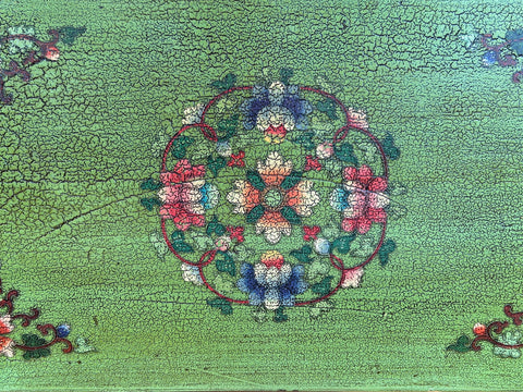 Ornate floral motifs and scrolling vines frame the central imagery, adorning the green-painted stiles and the top surface. The top of the cabinet showcases a complex, circular floral mandala, echoing traditional East Asian or Himalayan decorative patterns. When opened, the cabinet reveals a dark, rustic interior with a single mid-shelf, contrasting the exuberant exterior with a functional, somber workspace. Small, darkened brass pulls in the shape of traditional bells provide a subtle, tactile finish to the doors, completing this unique blend of utilitarian furniture and expressive storytelling.