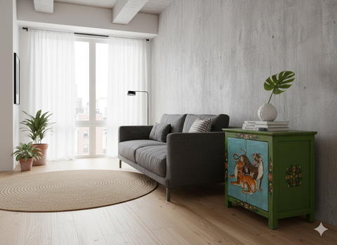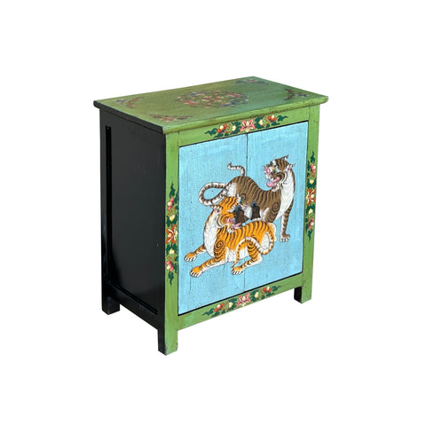 This striking, hand-painted wooden cabinet features a vibrant folk-art aesthetic, characterized by a bold palette of lime green, sky blue, and earthy tones. The front doors serve as a canvas for a dynamic depiction of two tigers—one tawny and one golden—intertwined in a spirited, stylized pose against a textured blue background. The artistry is defined by heavy "craquelure," a fine network of surface cracks that lends the piece an authentic, aged character.