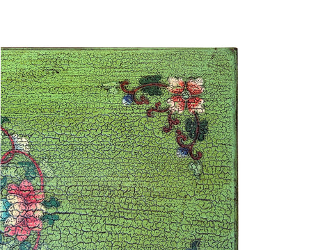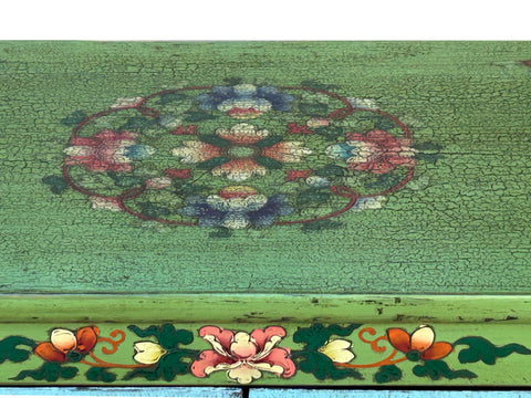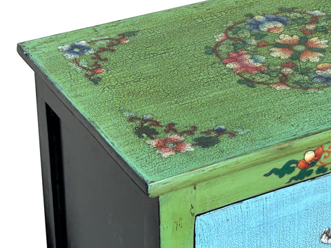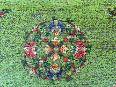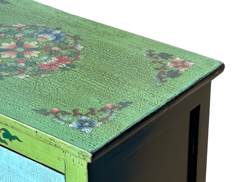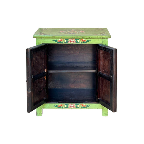 Ornate floral motifs and scrolling vines frame the central imagery, adorning the green-painted stiles and the top surface. The top of the cabinet showcases a complex, circular floral mandala, echoing traditional East Asian or Himalayan decorative patterns. When opened, the cabinet reveals a dark, rustic interior with a single mid-shelf, contrasting the exuberant exterior with a functional, somber workspace. Small, darkened brass pulls in the shape of traditional bells provide a subtle, tactile finish to the doors, completing this unique blend of utilitarian furniture and expressive storytelling.