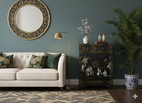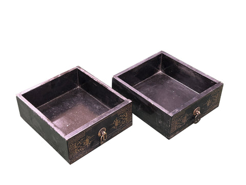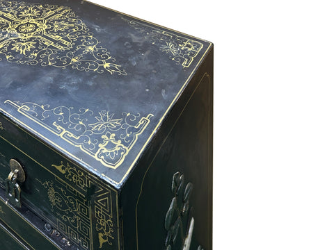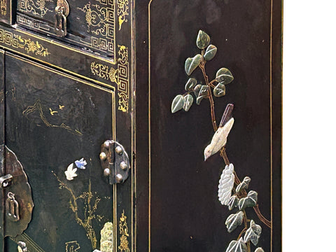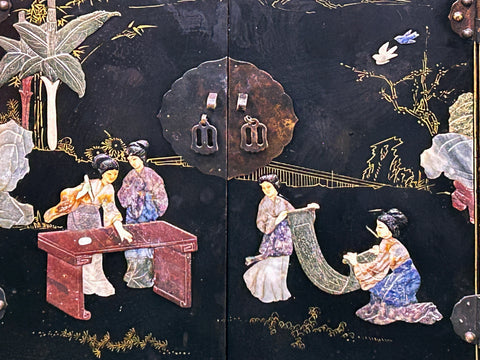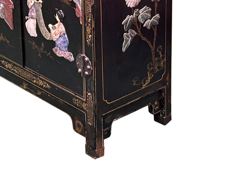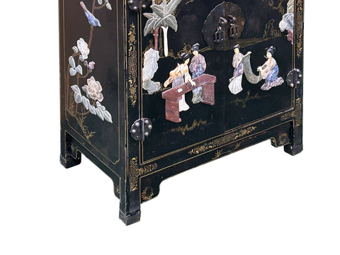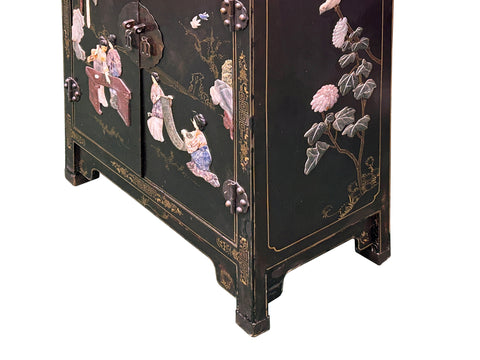 Vintage Chinoiseries Black & Stone Inlay Graphic End Table Nightstand GB140S