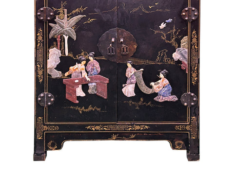 This is a beautiful, traditional Chinese black lacquered cabinet featuring striking decorative elements. The cabinet has a rectangular, upright form supported by bracket feet, and the main body is divided into two sections: two small drawers across the top and a double-door cupboard below. The overall surface is finished in a glossy black lacquer, which provides a dramatic contrast for the detailed decoration. Gold painting outlines the drawers and borders with intricate geometric patterns, including a variation of the key or meander motif. The doors of the cupboard are the focal point, adorned with a scene depicting figures in traditional dress, possibly of the Ming or Qing dynasty, rendered in hardstone or mother-of-pearl inlay (a technique known as qian baoli). The figures are engaged in domestic or leisure activities beneath palm-like foliage and birds in flight, set against a delicate gold-painted landscape. When the lower doors are opened, the interior reveals two storage shelves. The hardware, including the drawer pulls and the large central circular backplate and pulls on the main doors, is dark and metallic, complementing the cabinet's antique aesthetic.