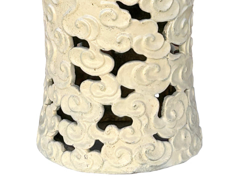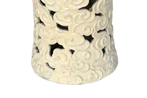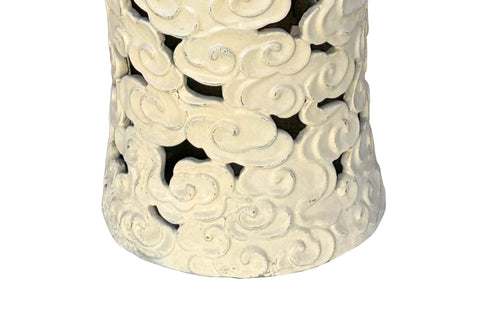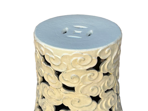 This is a beautiful cylindrical ceramic garden stool or side table, distinguished by its intricate openwork design and creamy, off-white glaze. The body features a dense, repeating cloud-scroll motif (often called Ruyi or Lingzhi cloud) that is deeply cut, creating an airy, lattice-like structure that allows light to pass through. The surface texture appears slightly matte or weathered, lending an antique character to the piece. The flat top surface is solid and features a subtle, stylized design reminiscent of a square-holed Chinese coin surrounded by four radiating oval vents, serving both as a decorative element and likely for ventilation or drainage. Tapering slightly towards the base, the stool has a classic, sturdy form and would function perfectly as an accent piece, small seat, or pedestal in a garden, patio, or indoor setting, bringing a touch of traditional Asian artistry.