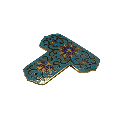 This T-shaped ornamental plaque is a vibrant example of cloisonné enamelwork, likely of Chinese origin. The piece is characterized by a brilliant turquoise-blue ground, which serves as a canvas for intricate floral and scrolling vine motifs. At the center and base are stylized, symmetrical lotus blossoms rendered in a rich palette of deep red, sunny yellow, and royal blue. These central flowers are framed by elegant, dark green ruyi-style scrolls—symbolizing good fortune—outlined in delicate gold-toned brass wire.