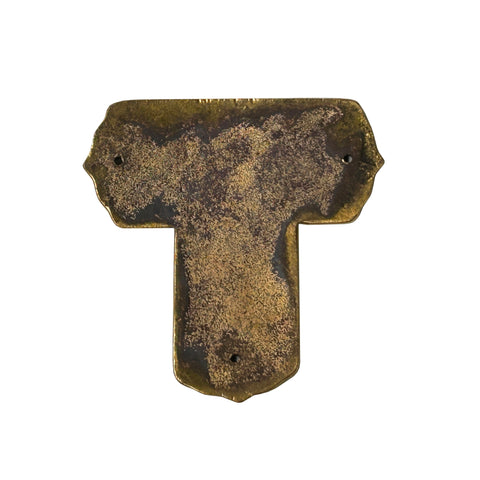 The plaque is crafted on a heavy brass or bronze base, visible on the reverse side, which shows a naturally aged, dark patina. Its unique T-shape features scalloped, "bracketed" edges and three small, pre-drilled holes—one at each end of the horizontal bar and one at the bottom—suggesting it was designed to be flush-mounted as a decorative fitting for a wooden cabinet, a jewelry chest, or perhaps a larger architectural screen. The combination of the rigid metal structure and the fluid, colorful enamel creates a balance of durability and refined artistry.