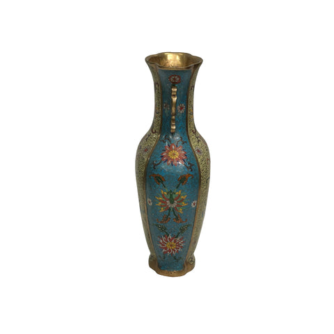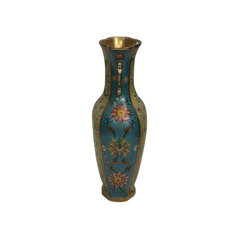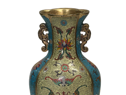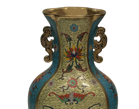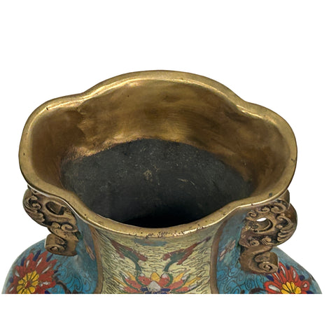 Vintage Cloisonné Vase Dragon Handles and Chinese Floral Motifs - Turquoise Decor ws4891S