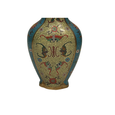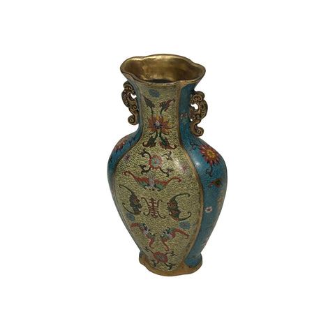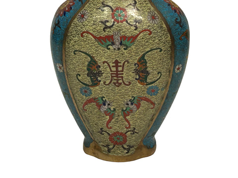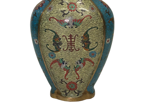 Enhance your home decor with the timeless elegance of this exquisite Vintage Cloisonné Vase. Crafted with meticulous attention to detail, this vase features ancient Chinese dragon-shaped ear handles and vibrant traditional Chinese floral patterns on a stunning turquoise background. The center pattern, symbolizing “Bat - Fok” and “Longevity - Shou,” adds meaningful cultural significance. The ornate bronze handles further enhance its antique charm, making it a perfect piece for collectors and enthusiasts of antique decor. Ideal for showcasing on a mantel or as a centerpiece, this vintage Cloisonné vase is a testament to the artistry of Chinese craftsmanship
