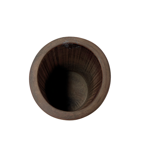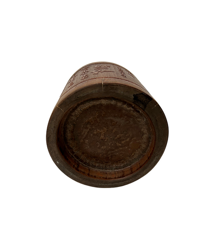 This handsome cylindrical brush pot, or bitong, is crafted from finely aged bamboo, its warm, reddish-brown patina deepened by decades of gentle handling. The surface is meticulously carved in low relief with vertical columns of elegant Chinese calligraphy—flowing, confident strokes of poetry or prose that wrap continuously around the vessel, interrupted only by subtle decorative borders of scrolling clouds at the rim and base. The characters, raised against the textured background of natural bamboo grain, catch the light softly, giving the piece a quiet scholarly grace. Standing just tall enough to hold a generous bundle of brushes, the interior is smoothly hollowed and darkened from years of use, with faint traces of old ink lingering near the rim. The walls are reassuringly thick, the base solid and slightly convex, and a few honest hairline cracks along the grain speak to its genuine age rather than detract from its character. It is the sort of object that once sat on a Qing or early Republican literati’s desk, quietly accompanying the composition of letters, poems, and paintings—an understated yet eloquent testament to refined taste and the enduring beauty of bamboo craftsmanship.