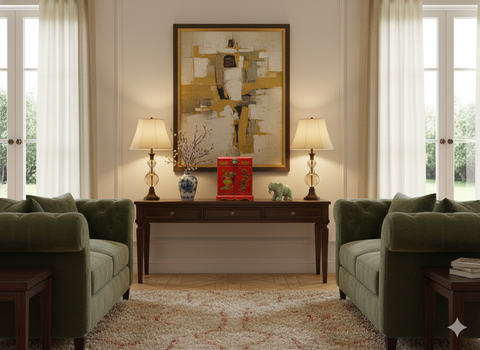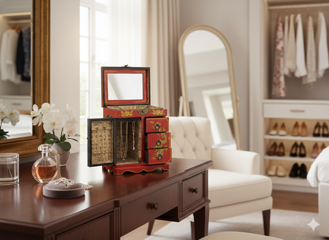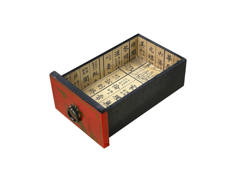 This ornate oriental jewelry chest is a striking example of traditional craftsmanship, featuring a vibrant red lacquer finish adorned with intricate golden motifs. The front of the cabinet displays a harmonious pairing of a majestic phoenix on the left door and a winding dragon spanning three stacked drawers on the right, symbolizing power and grace. Each drawer and door is fitted with antiqued brass ring pulls, while the top lid is secured by a decorative butterfly-shaped clasp. When opened, the chest reveals a multifaceted storage system, including a top-mounted mirror, a shallow upper tray, and a hidden side compartment equipped with small hooks for necklaces. The interior is meticulously lined with parchment-style paper featuring vintage Chinese calligraphy and illustrations, creating a beautiful contrast between the bold exterior and the detailed, scholarly aesthetic of the inner chambers.